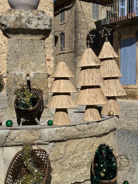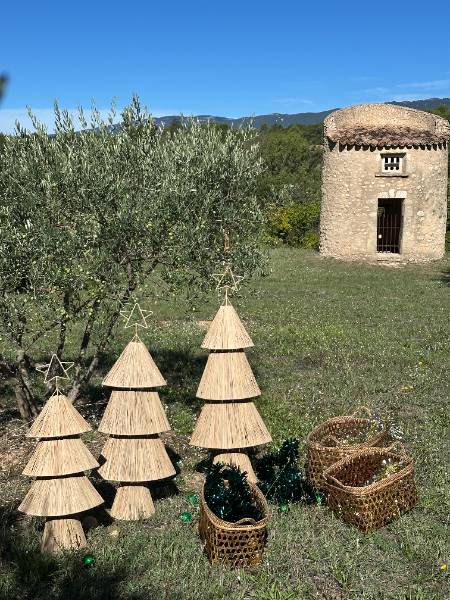 Nos sapins sont accompagnés de panières tissées, contenant une variété de boules colorées et de guirlandes scintillantes, permettant une décoration féerique et festive. Laissez vous tenter par un ou plusieurs modèles, ils seront accompagnés de la structure naturelle de votre choix.